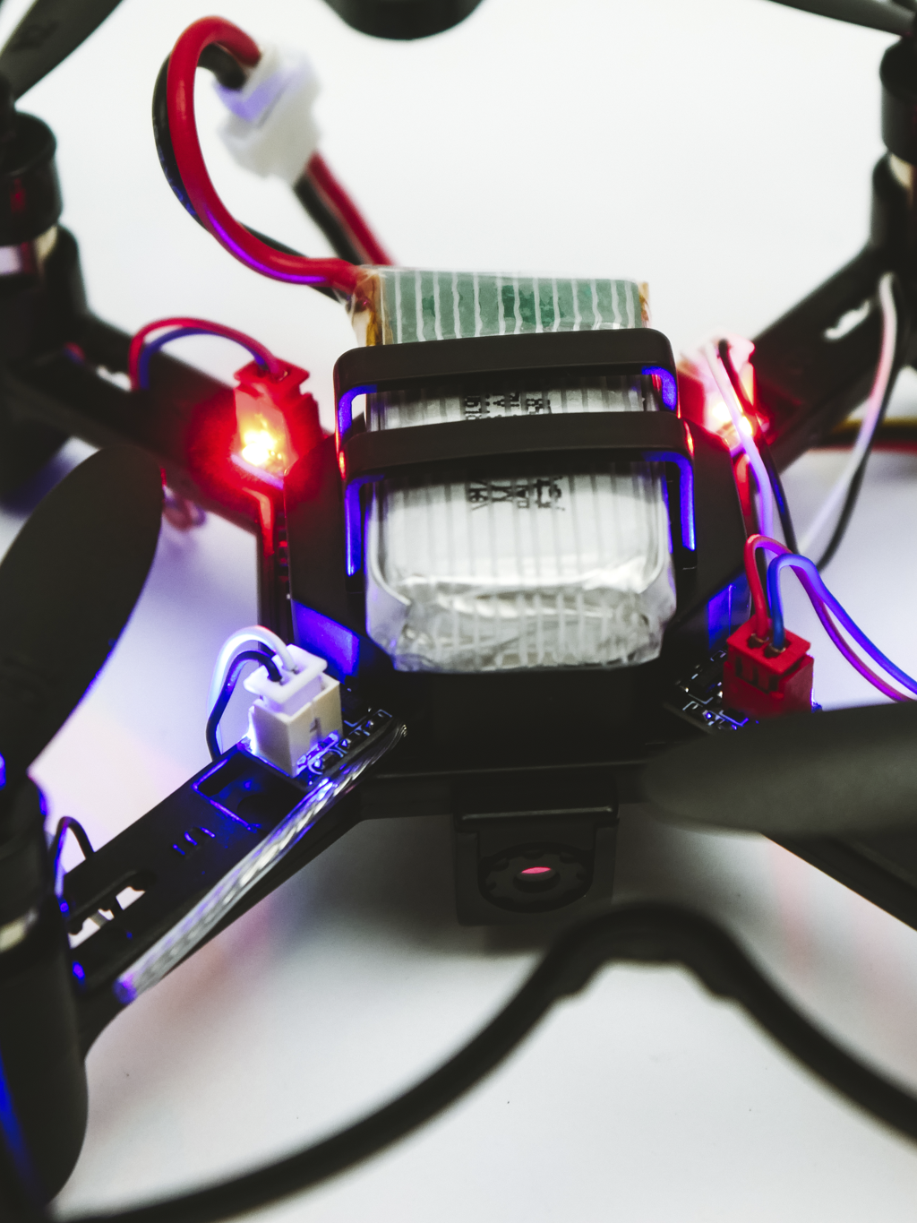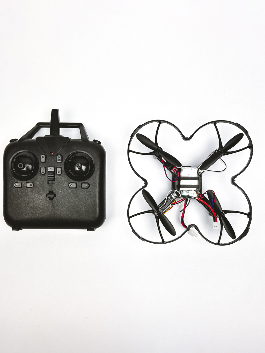 Включите дрон и пульт. Поднимите левый стик пульта до упора вверх, затем опустите до упора вниз. Индикатор на дроне перестанет мигать и будет гореть постоянно — сопряжение завершено - Калибровка: